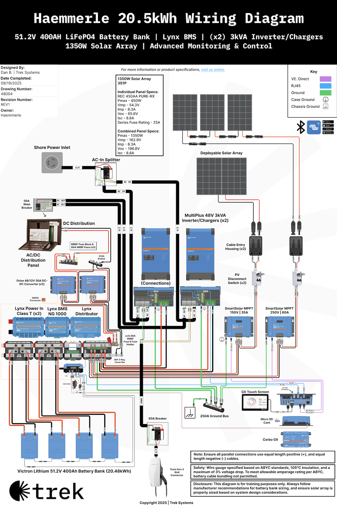 太阳能通过两个SmartSolar MPPT 150/35太阳能充电控制器收集,这些控制器将电力储存在四个NG锂电池中,额定电压为51.2V,电流为100Ah,提供20kWh的储存能量。(最新的NG下一代锂电池,顺便说一下,具有内置的保险丝,并且先进的通信功能,允许最多50块电池组合在一起。NG电池的强制电池管理系统是Lynx Smart BMS NG。)