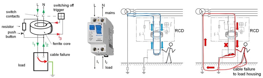 额定剩余电流为 30mA 的 RCD 开关应在故障电流超过 15mA 时断开,因此关闭时间通常低于 100 毫秒。但是,RCD 开关无法检测负载中的短路。为此,使用已经描述的 MCB。RCD 开关仅在电流“流”到它不应该流的地方时(流过金属外壳或流过人体流向地面)才会做出反应!